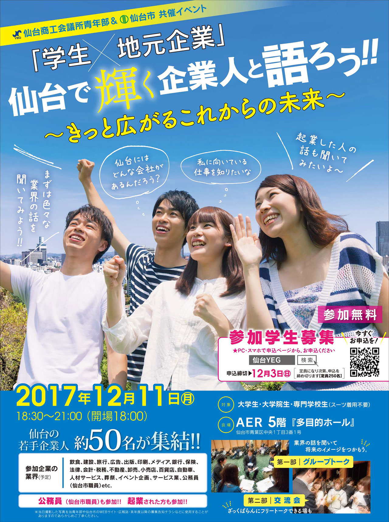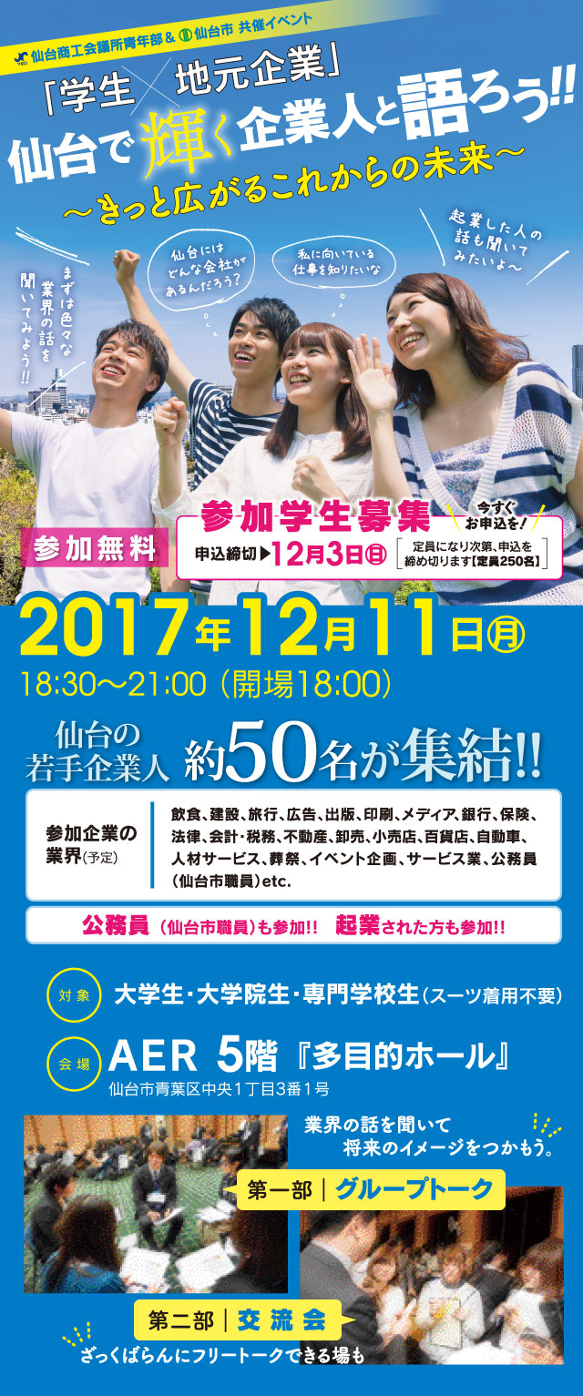 | 会場 | AER 5階「多目的ホール」 〒980-0021 宮城県仙台市青葉区中央1-3-1 |